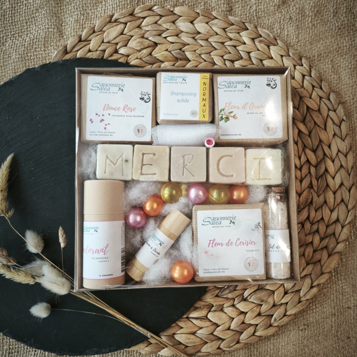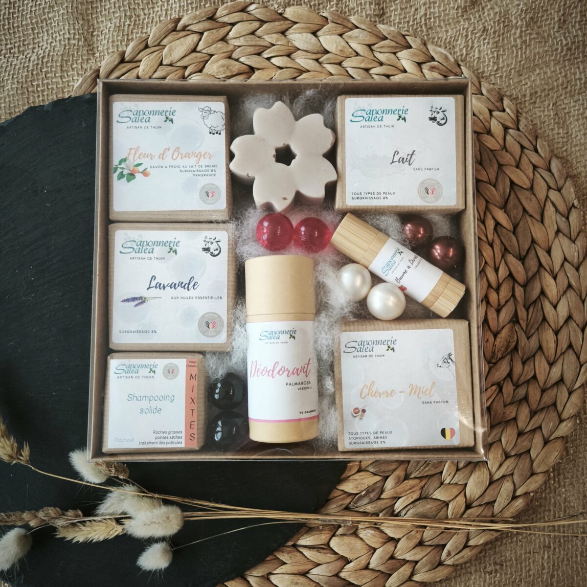 Soin des lèvres & accessoires : baume à lèvres, porte-savon, sac/pochon, petit mot en cubes.
