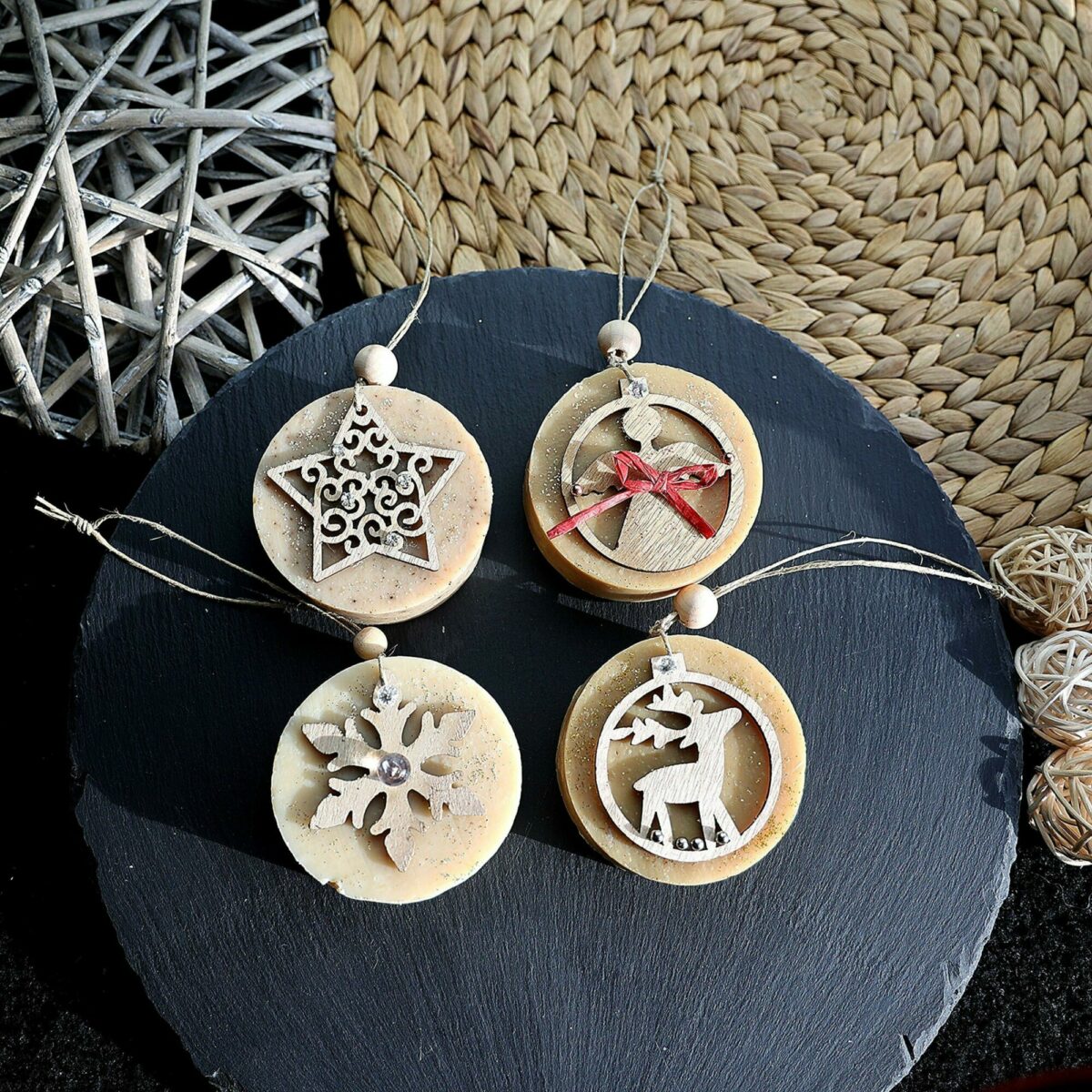 Ajoutez une touche d’originalité à votre sapin avec nos boules de Noël en savon. Ces savons artisanaux, joliment suspendus avec un pendentif en bois, apportent une décoration festive et parfumée. Une fois les fêtes terminées, utilisez-les comme savon pour prolonger la magie de Noël dans votre salle de bain. Fabriquées avec soin et conçues pour respecter votre peau, elles allient esthétique et utilité.